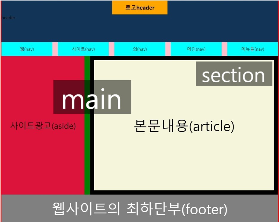 개발자들이 원하는 이름(id,class)으로 코딩을 진행하면 제3자가 웹사이트를 유지보수 할 때 문제가 될 수 있어서 웹사이트의 공간을 분할하여 태그화 시켜서 구분지어 누구나 유지보수 할 때 수정할 부분을 알아보기 쉽게 만든 태그이며 속성은 display:block이다.