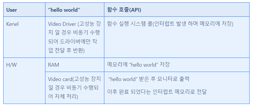 API (Application Programming Interface) 커널 영역에서 입출력이 일어나도록 역할을 하는데 이때 수행되는 함수를 System Call이라고 한다.