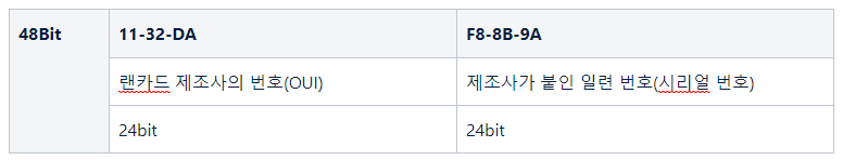 이더넷에서 인터페이스를 특정하기 위한 48bit의 물리적인 주소(하드웨어 주소)
