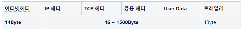 데이터 단위는 프레임으로 이더넷 헤더 + IP 헤더 + TCP 헤더 + 응용 헤더 + User Data + 트레일러로 구성
