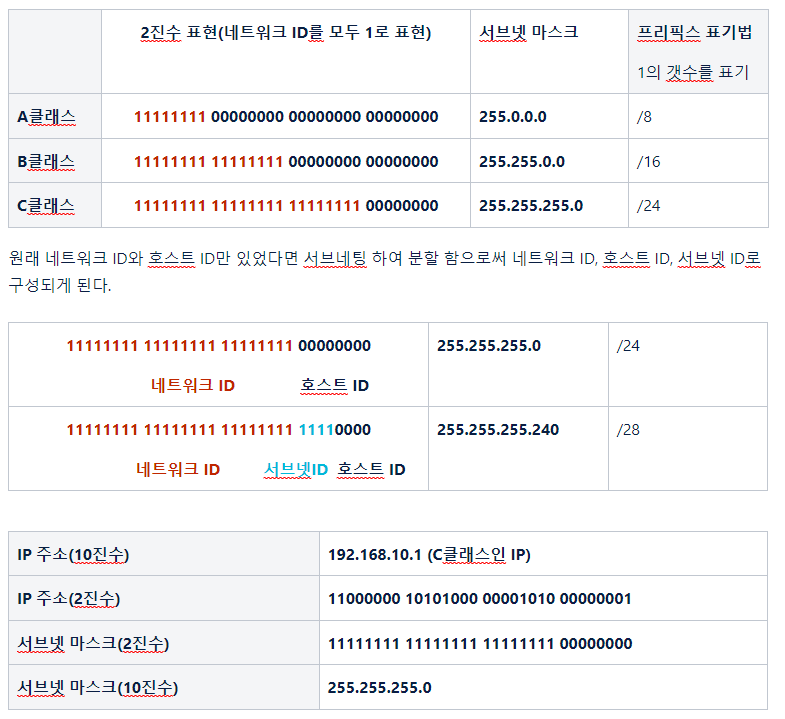 - 서브네팅: IP주소를 클래스로 구분하는 방법, 네트워크를 분할하는 것(많은 IP주소가 낭비 되는 것을 방지)