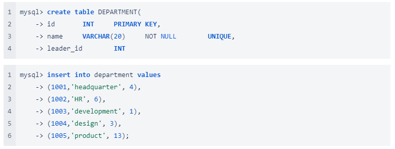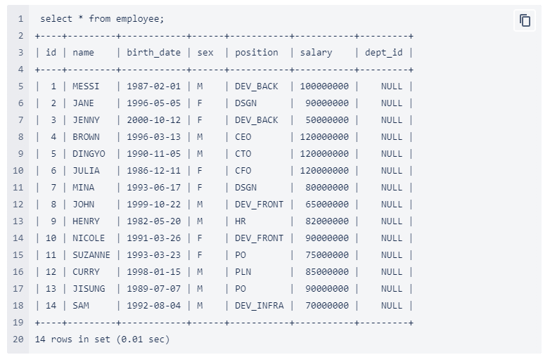 순서대로 나열하여 데이터를 추가하게 된다. dept_id에 NULL값을 넣은 이유는 현재 DEPARTMENT에 아무 값도 없기 때문임