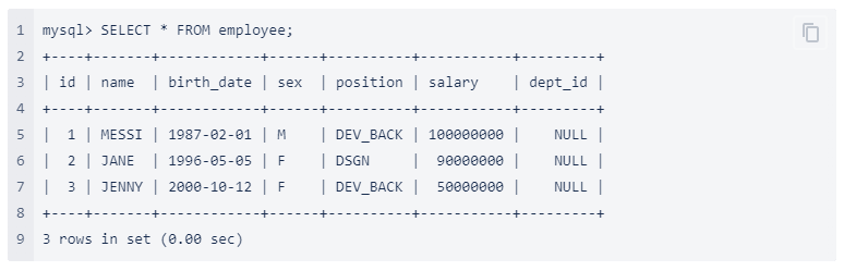 -> VALUES (1, 'MESSI', '1987-02-01', 'M', 'DEV_BACK', 100000000, NULL);