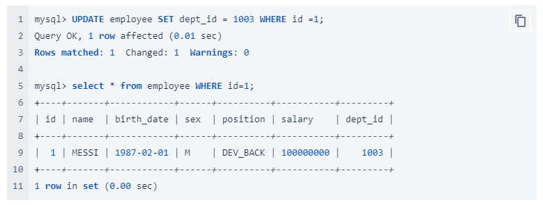 mysql> UPDATE employee, works_on //2개의 테이블을 참조하여 쿼리 작성