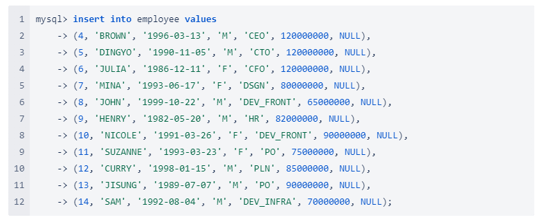 ERROR 1062 (23000): Duplicate entry '1' for key 'employee.PRIMARY' //PRIMARY KEY 1이 중복으로 에러