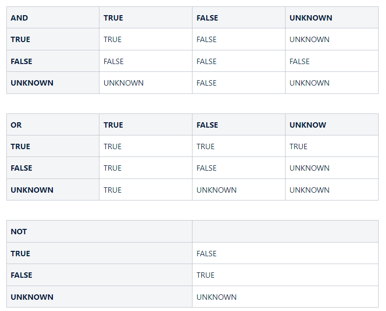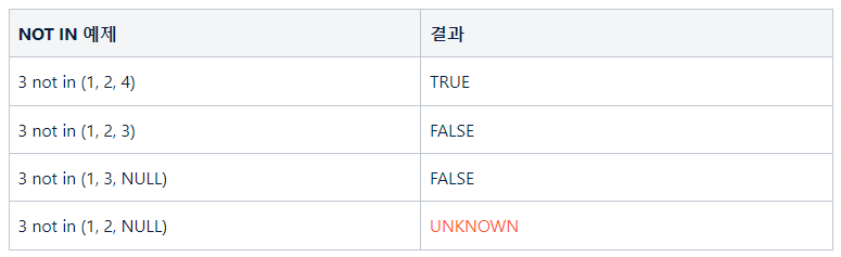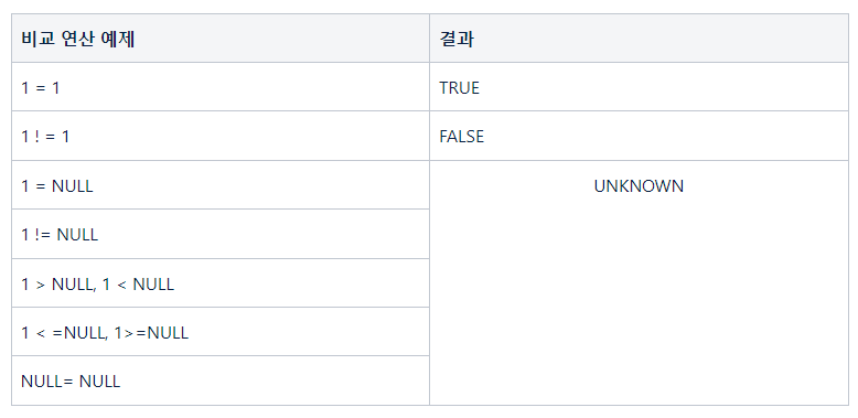 즉, 결과가 FALSE거나 UNKNWON이면 tuple은 선택되지 않는다.