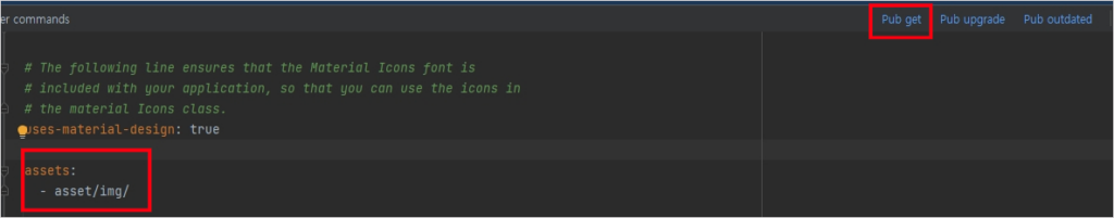 프로젝트의 asset 추가 시 pubspec.yaml의 파일에 등록 후 Pub get를 눌러 적용한다.